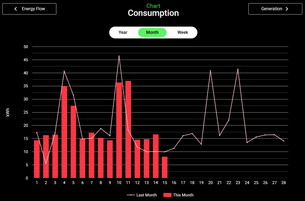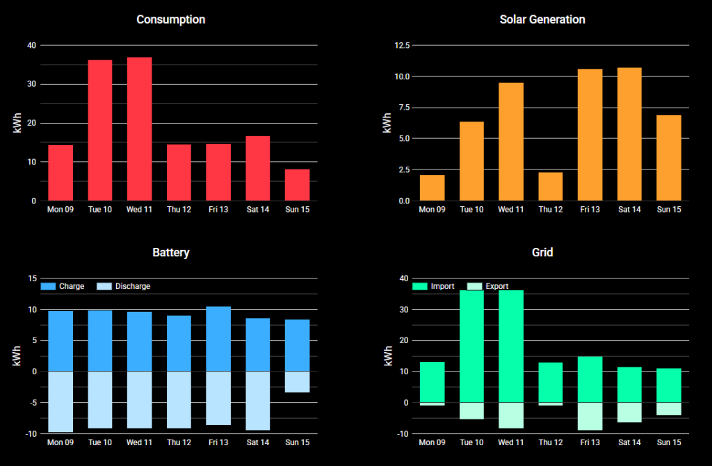 Consumption, Generation, Battery Charge / Discharge and Grid In / Out for the past 7 days.