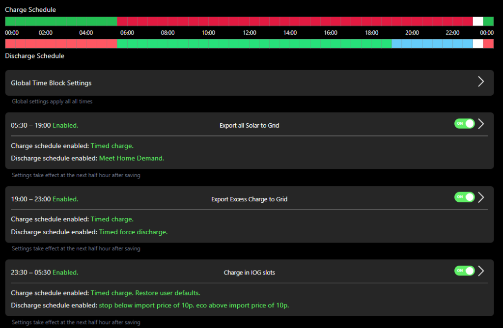 With 30 minute time intervals, you can choose how your inverter controls your battery every 30 minutes, 48 slots a day!