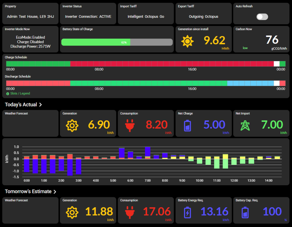 Use the dashboard to keep an eye on key stats, including consumption and generation data, carbon intensity, and of course a summary of your charge and discharge schedule. See how your energy flow is going through the day.
